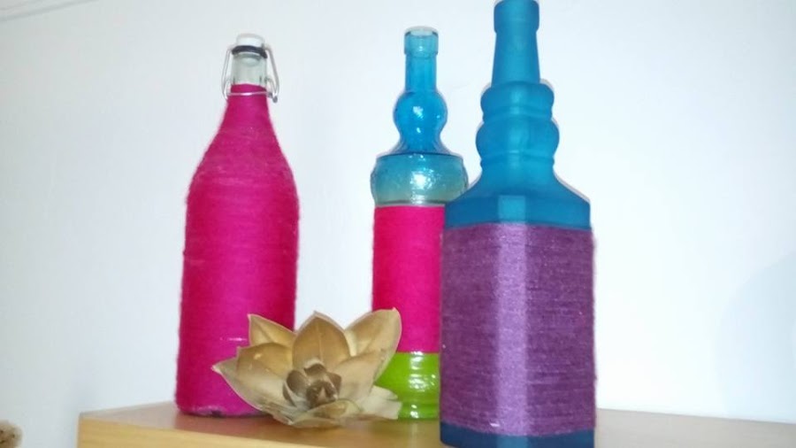Dejamos secar la lana. ¡y ya tenemos las botellas decoradas!