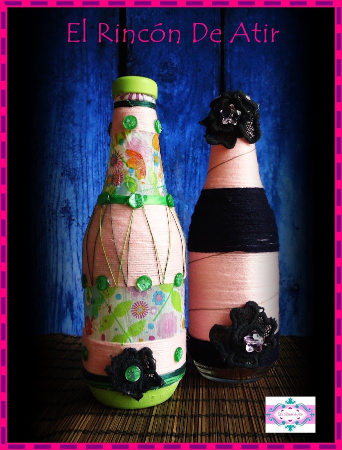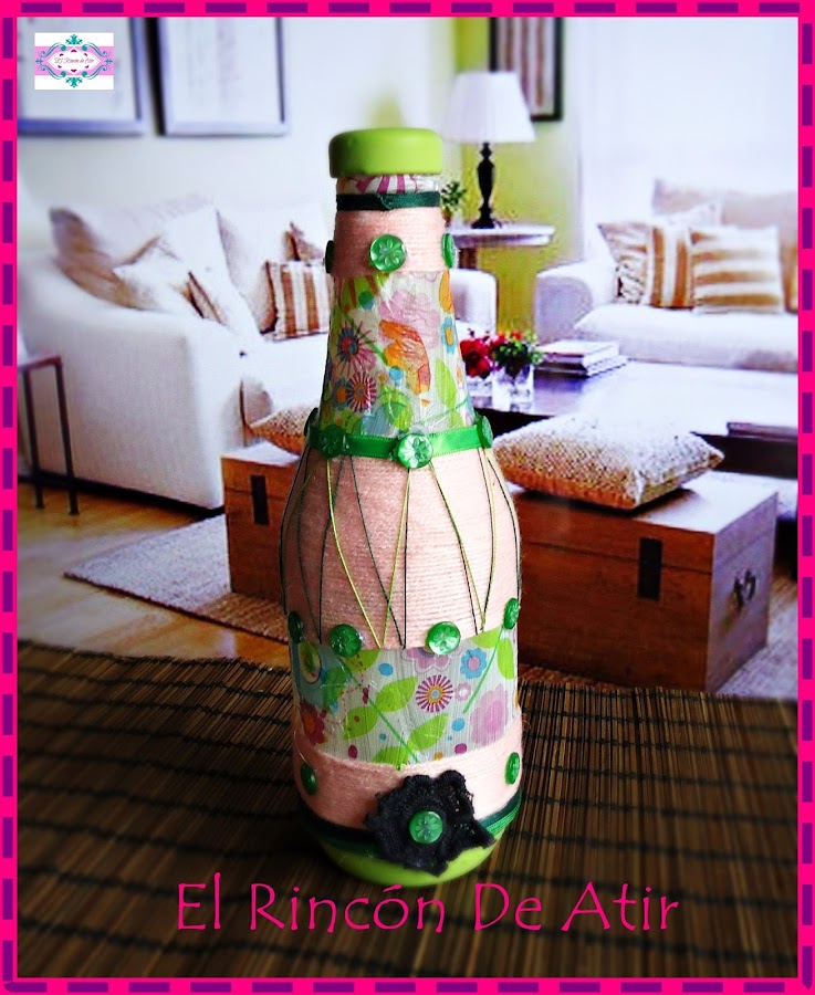 Primero cubrí la botella con servilletas decoradas con la técnica de decoupage. La base de la botella y el tapón los pinté de verde. Después cubrí algunas zonas con diferentes hilos, algunos cruzados, y para finalizar decoré con botones y una flor de tela.