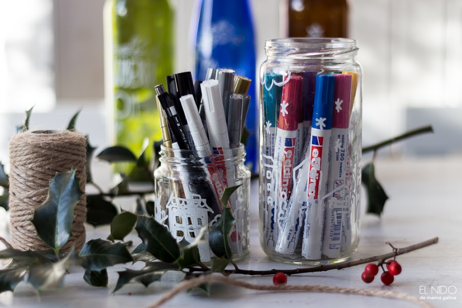 Como ves los materiales no pueden ser más sencillos y baratos: botes y botellas de cristal normales y corrientes y rotuladores permanentes de los de toda la vida. Siempre he utilizado los de la marca Edding y ahora, además de los normales negro, rojo, verde y azul, los tienen en blanco, metalizados y muchos colores más. Me encantan porque se secan muy rápido y son muy cubrientes, con aspecto de esmalte, además, lo mejor de todo es que no se quitan.