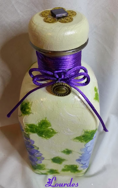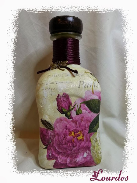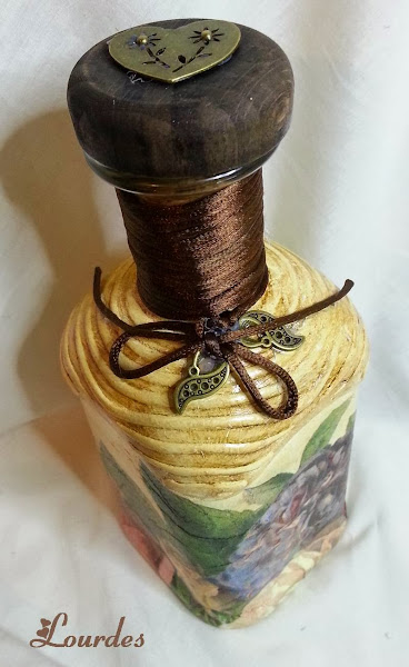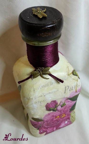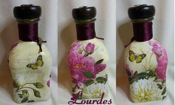 Este trabajo surgió de repente. Las necesita para YA y como soy muy cabezona... pues manos a la obra Esta está realizada además del decoupage, con sello, tinta transparente y polvos embossing dorados( y por supuesto pistola de calor). Por cierto,bastante difícil poner el sello en la botella, sobre todo en su zona curva. Cuello de la botella con cola de ratón y adorno metálico e ...