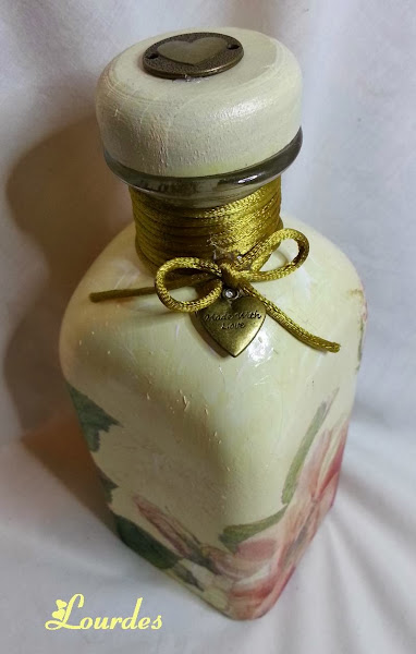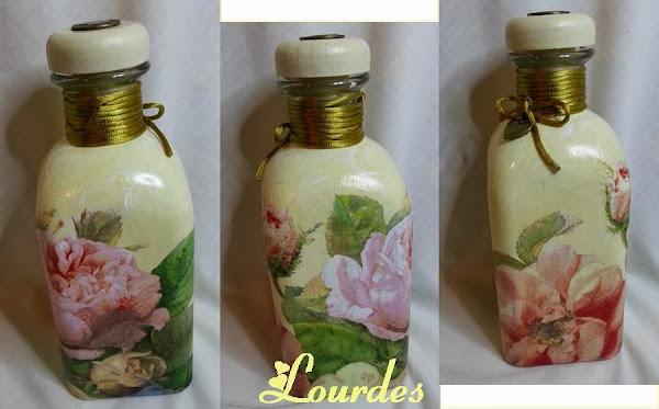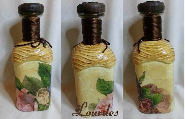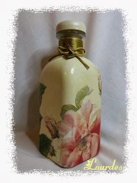 Adornos metálicos en oro viejo. Alto de la botella 21 ctm. Decoupage con servilleta.