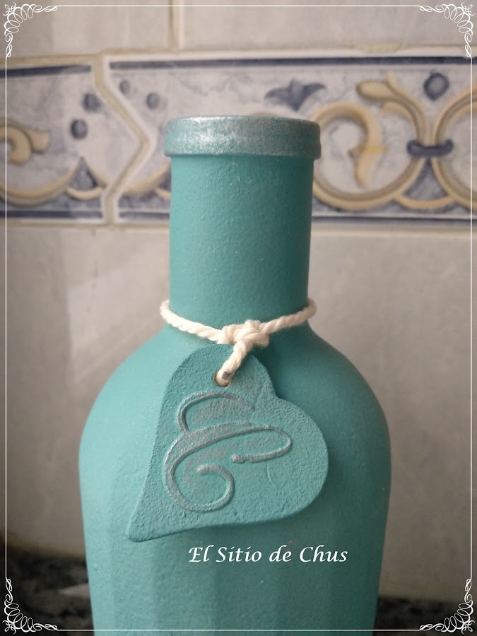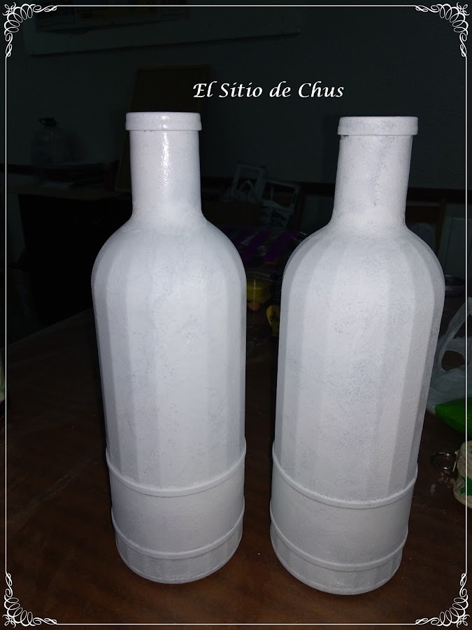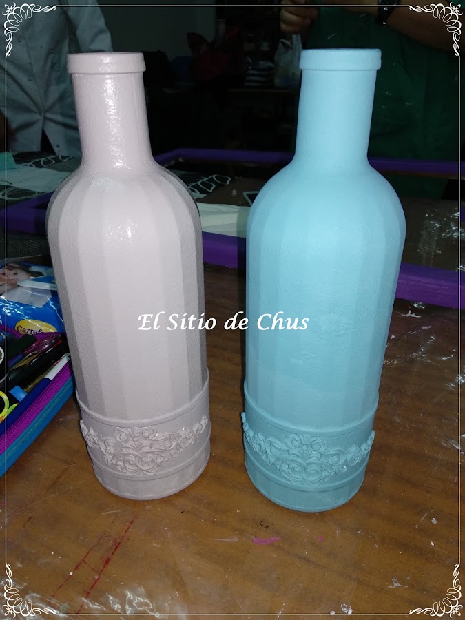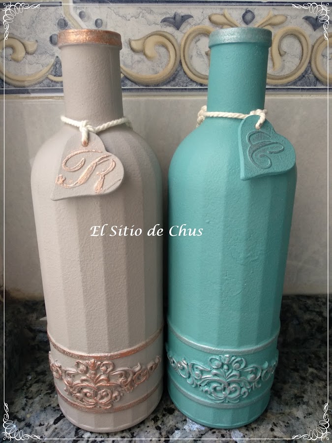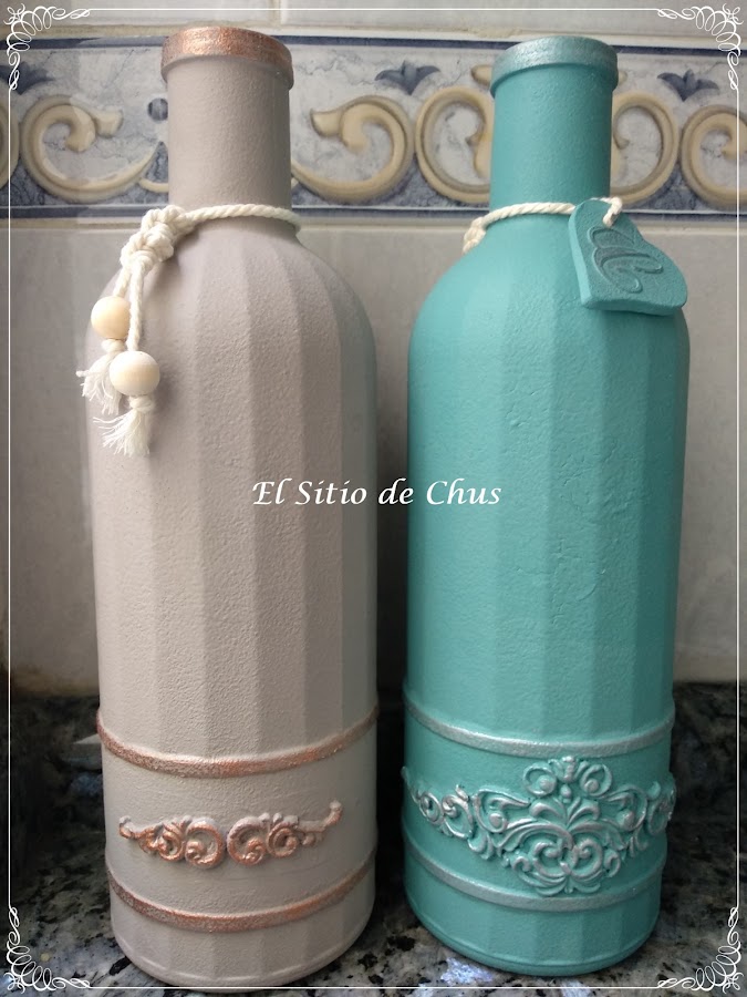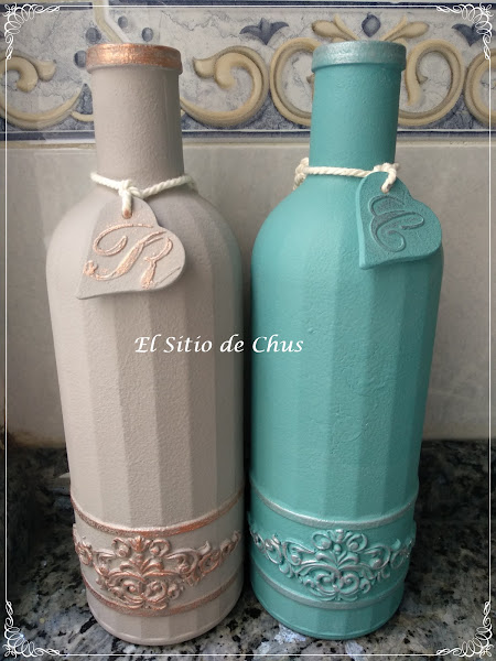 Una vez puestos los moldes pinté las botellas con pintura a la tiza, la de color topo para Rufi y la azul turquesa para mí.