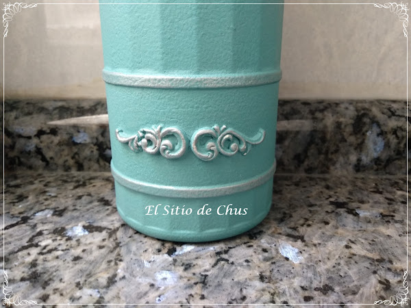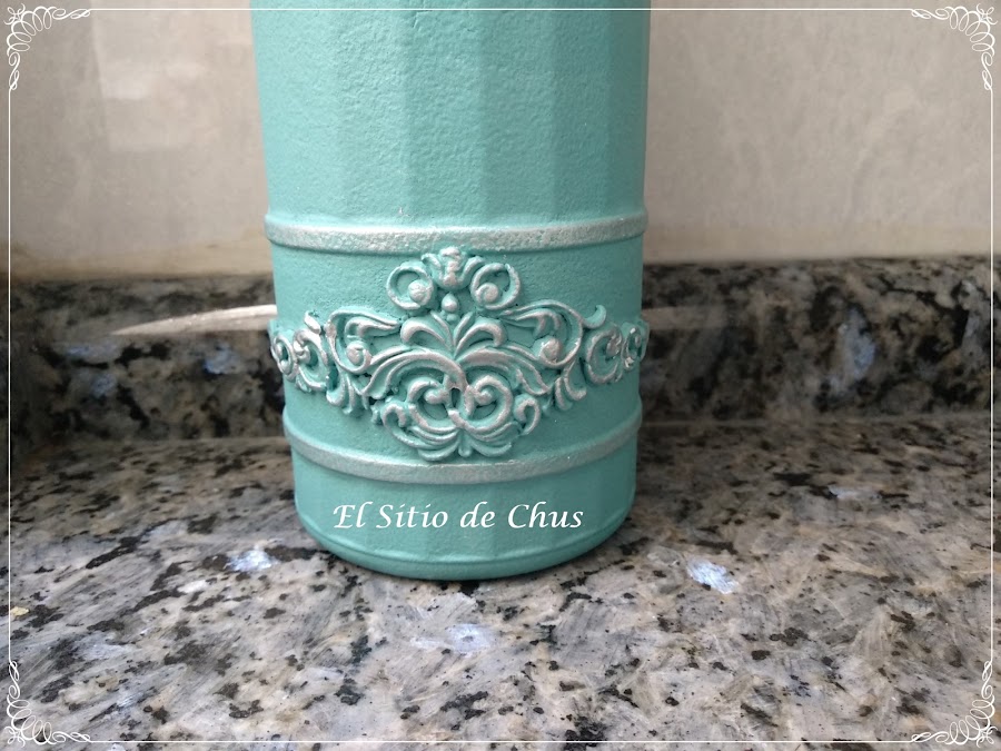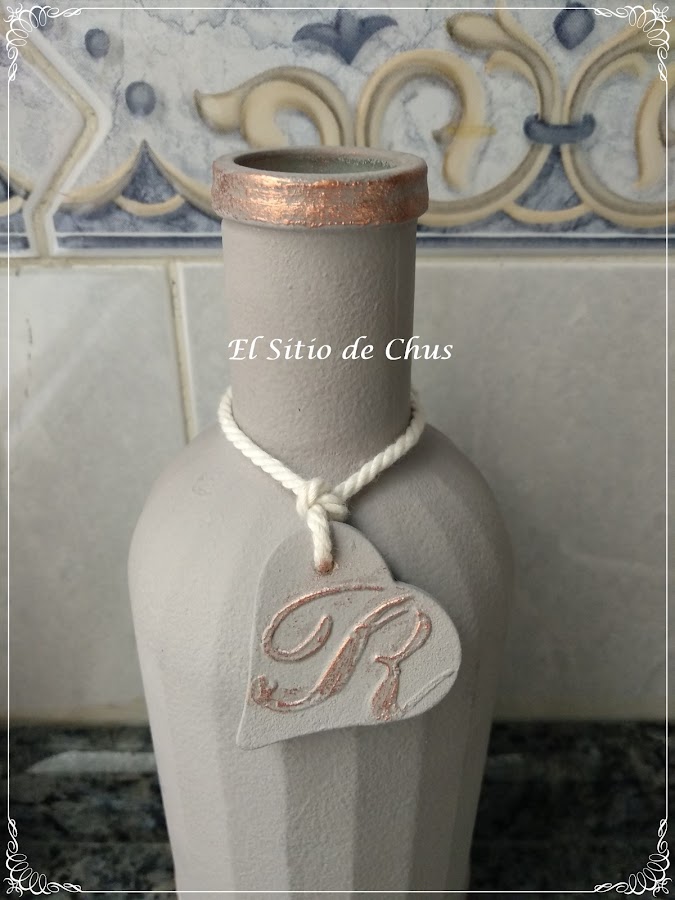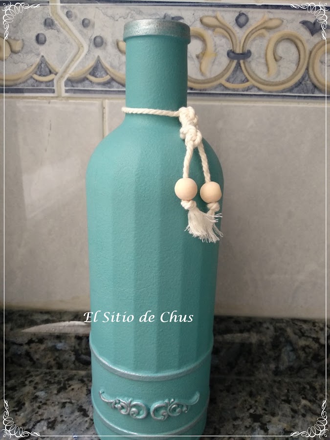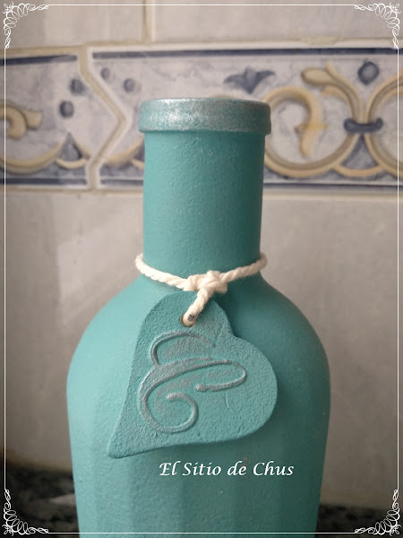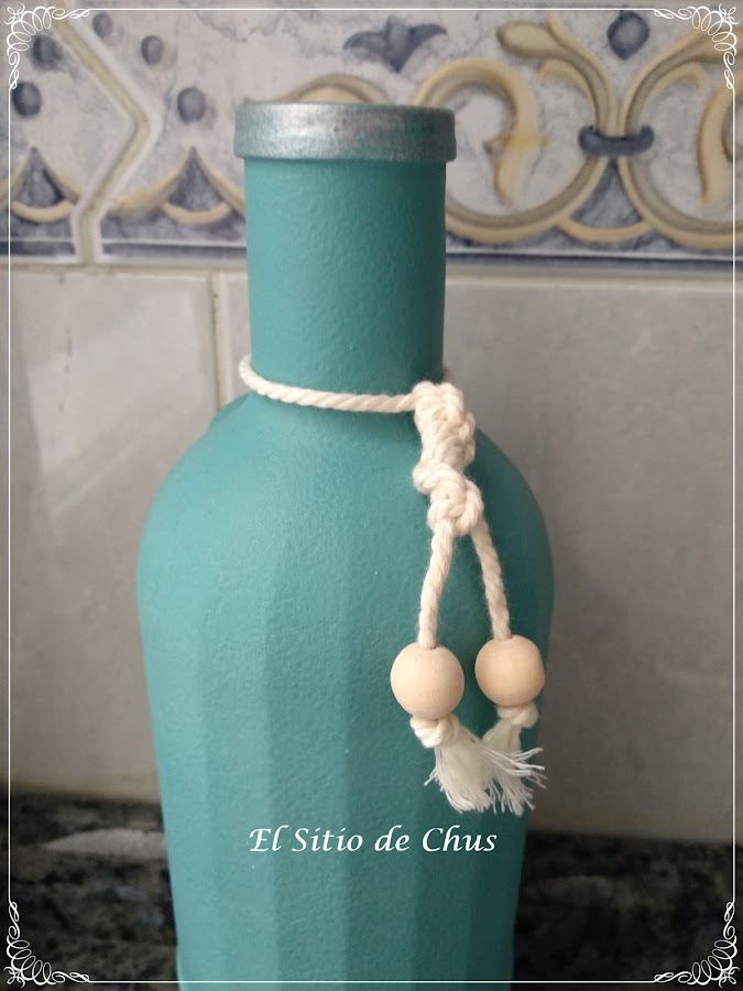 Una vez puestos los moldes pinté las botellas con pintura a la tiza, la de color topo para Rufi y la azul turquesa para mí.
