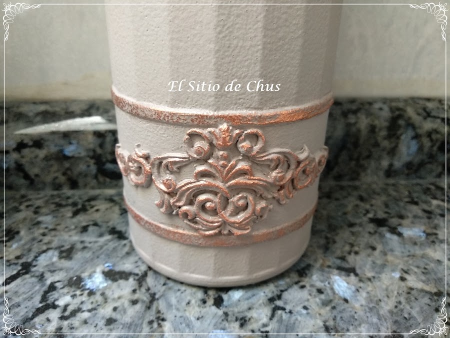 Con unos pátinas en polvo que tengo, le dí un toque de color a los modes y a los salientes que traían las botellas de serie
