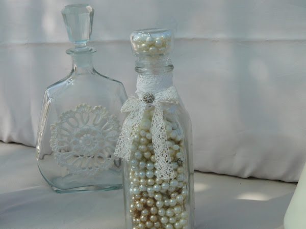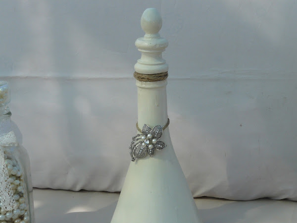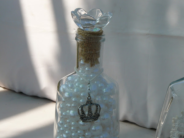 La más pequeña es una botella de aceite, el tapón que traia era de corcho y para sustituirlo he usado un bote de ambientador al que he quitado el tapón de plastico y llenado de perlas. La botella está llena de collares.