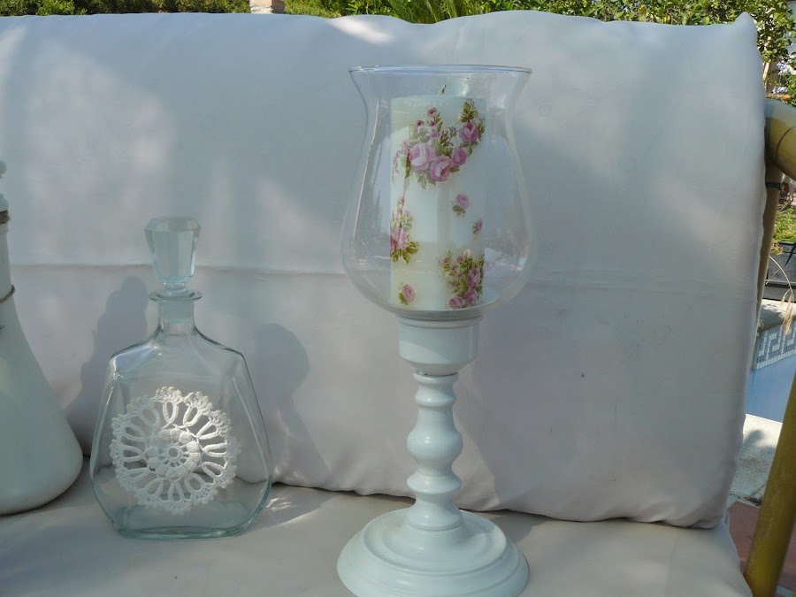 A la última sólo le he pegado una aplicación de ganchillo. También he decorado la vela con decoupage.