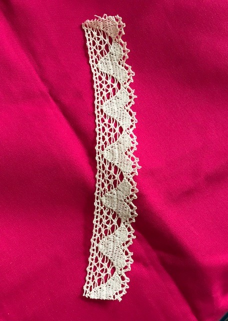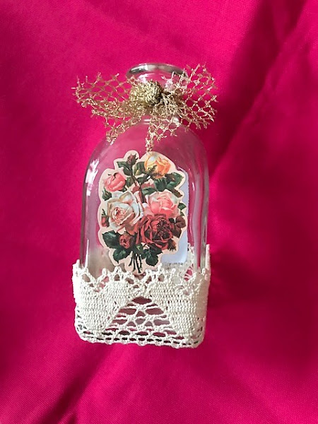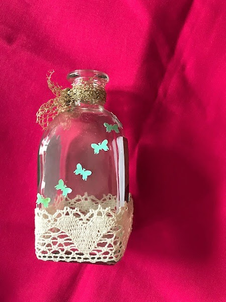 Mido el diámetro de la botellita y corto la puntilla que la cerrare a punto de repulgo y luego la fijare con un poco de cola transparente.