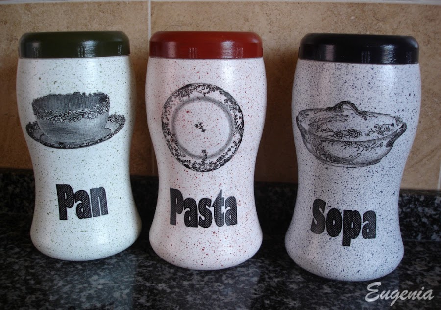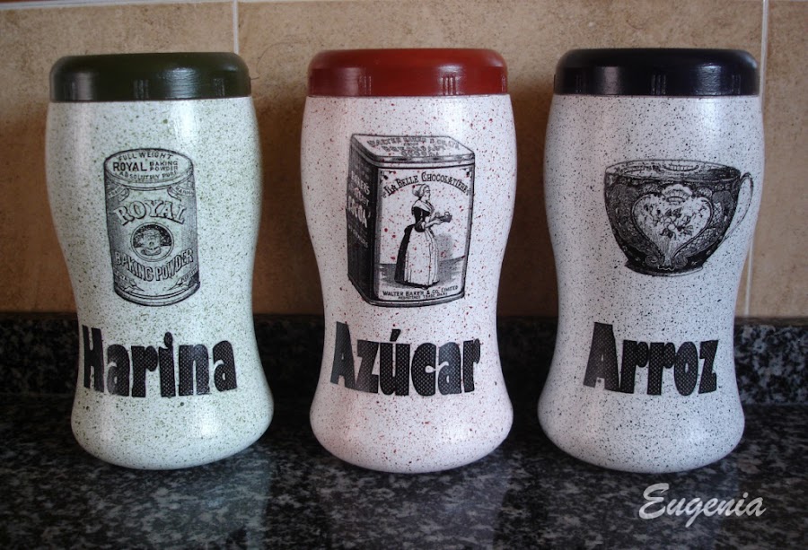 Aquí os traigo unos botes de cocina que le hice a mi hermana con botes de cacao.