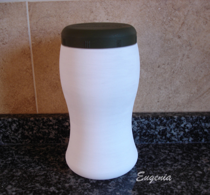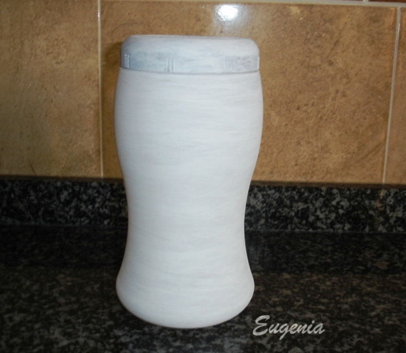Damos dos manos de imprimación y luego dos manos de pintura blanca al bote y de otro color a la tapa (lijando siempre entre mano y mano).