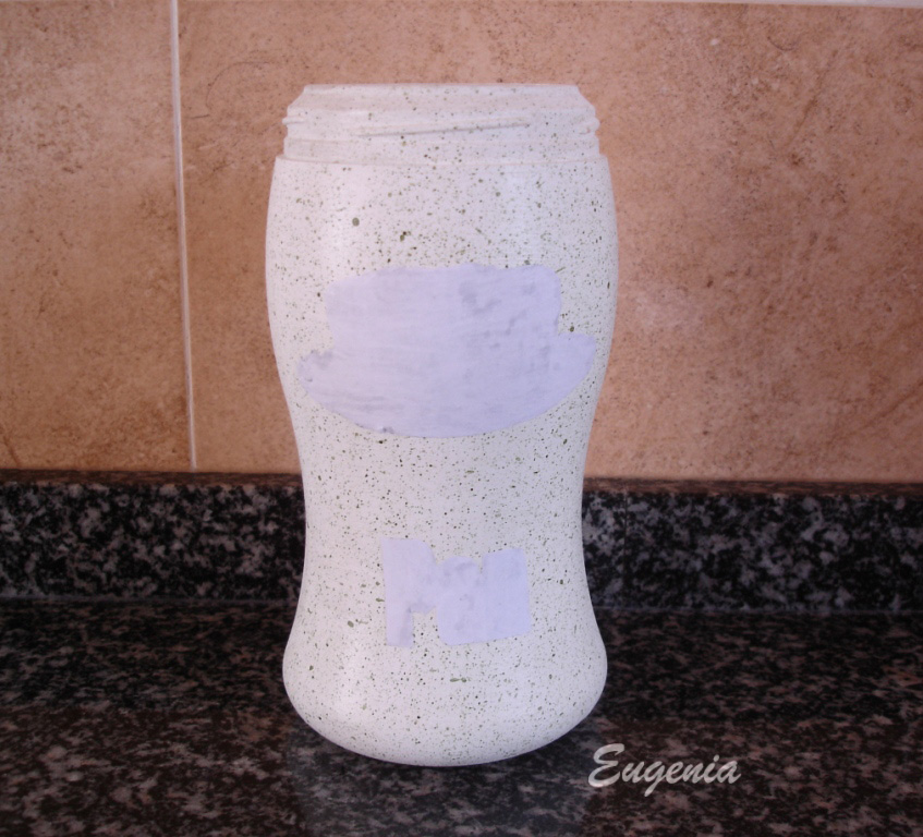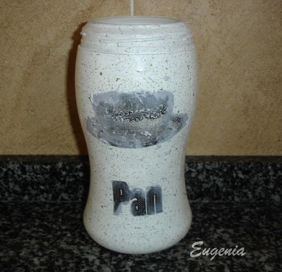Recortamos las imágenes imprimidas con láser y giradas en espejo y las pegamos al bote con látex, procurando que no queden burbujas ni arrugas y ayudándonos con una cuchara.