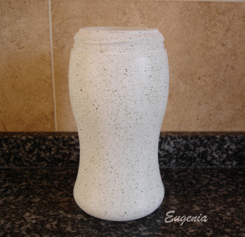 Con un cepillo de dientes hacemos el salpicado en el cuerpo del bote con el mismo color de la tapa y damos una mano de látex para proteger la pintura antes de hacer el transfer.