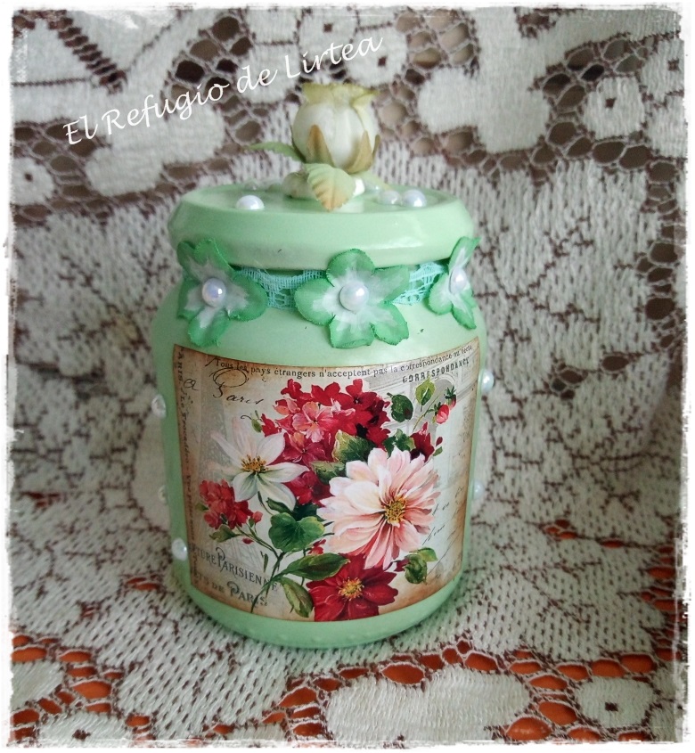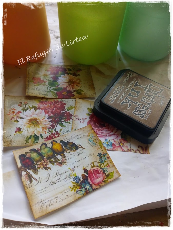 Recorté imágenes florales, les entinté los bordes, dejo secar la tinta y las pego sobre los botes con medium para decoupage, dando también una mano por encima con dicho pegamento para protegerlas.