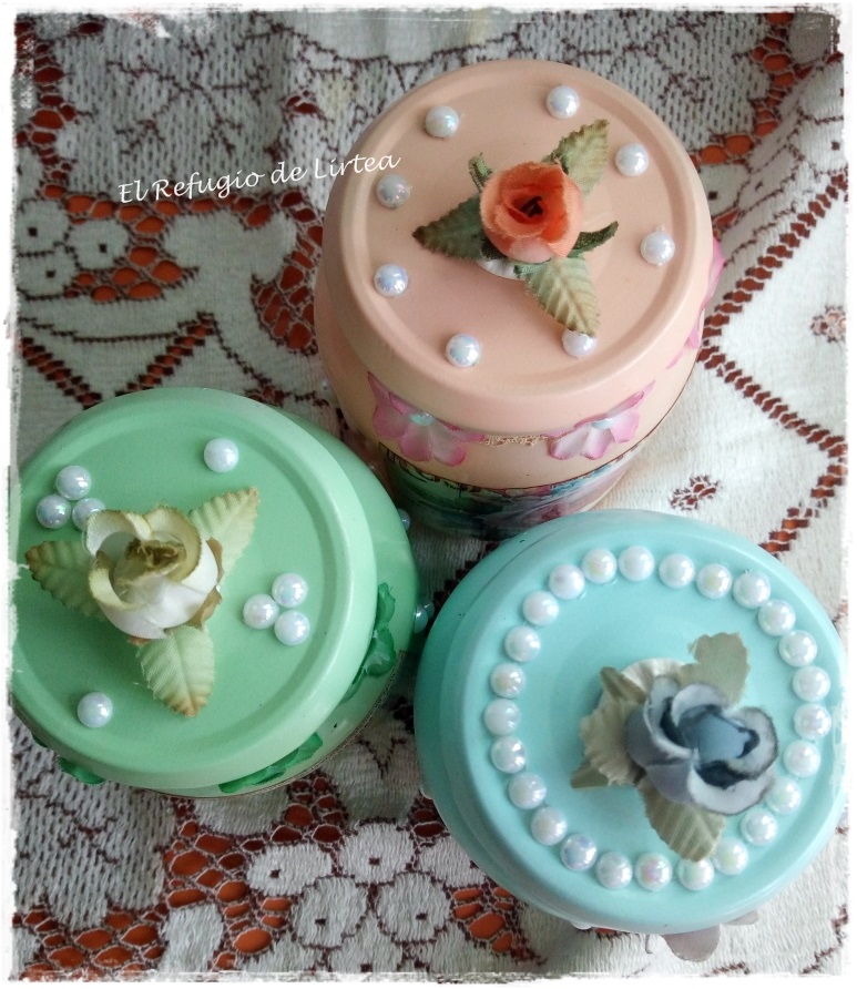 En las tapas pegue unas perlas, una figura realizada con pasta de modelar y sobre ella unas flores en los tonos de acorde con cada bote.