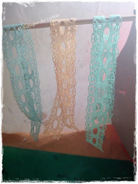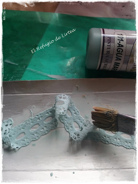 Tome unos trozos de encaje blanco y los "teñí" con pintura acrílica muy aguada en los mismos tonos que pinté los botes.