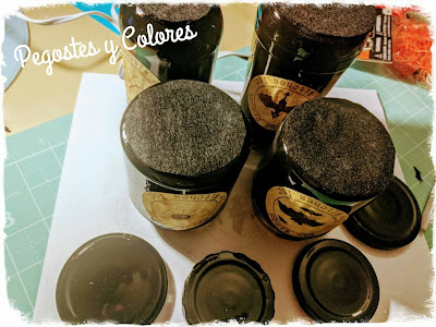 5.- Recorte 4 circulos en fieltro negro midiendo las bases de cada frasco y se las pegue con silicona. Esto es para que no rayen o dejen restos de pintura en la superficie donde los ponga.