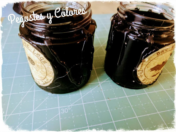 4.- Una vez secos los frascos retiramos la cinta de pintor y pegamos cada etiqueta con mod podge.