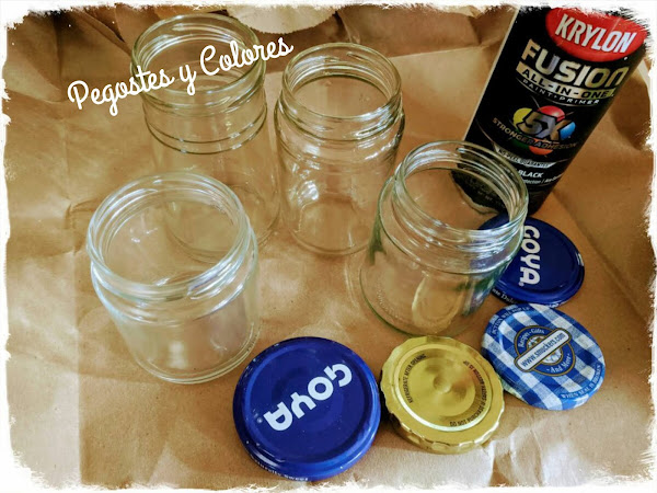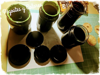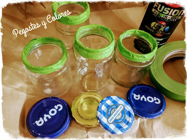 2.- Poner cinta de pintor alrededor del cuello, En una area ventilada rociar con pintura negra los frascos y tapas. Dejar secar.