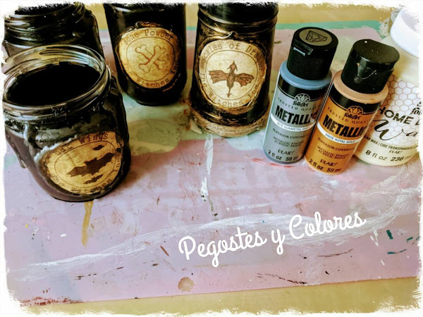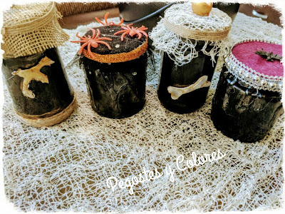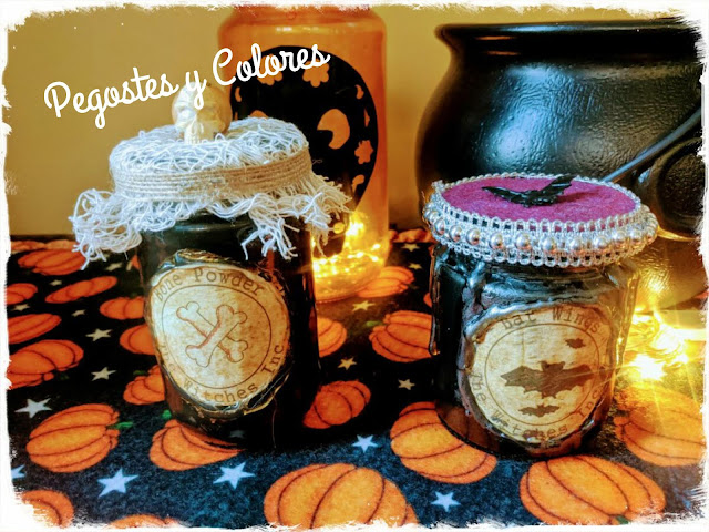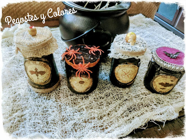 Esta idea no es nueva, hay muchos tutoriales en blogs y en Youtube sobre como hacer frascos de pociones o una boticaria completa de Halloween para decorar. Hay muchos estilos y yo solo tome lo que ya tenia en casa y recicle unos frascos, rescate restos de telas, listones y adornos y listo. Me hubiera gustado usar botellas con corcho para darles un toque mas antiguo o algún frasco de perfume, pero solo tengo un par de botellas que me parecieron demasiado grandes y que estoy reservando para otro trabajo. Pero al final quede muy complacida con los frascos que tenia.