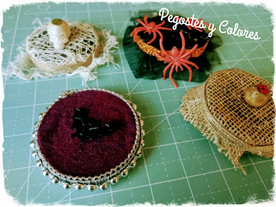 7.- Tome unos anillos de plástico de Halloween y les recorte la tira que se atora en el dedo, dejando solo la figura. Tome diferentes elementos: Fieltro, arpilla, gasa vieja y desgarrada, tul con brillitos y cintas de diferentes colores y los fui pegando para hacer tapas diferentes. A algunas les pegue en el centro de la tapa una cuenta de madera junto con la pieza de plástico del anillo.
