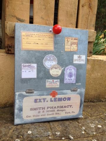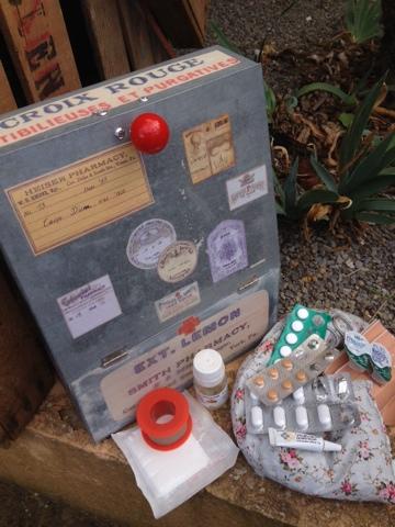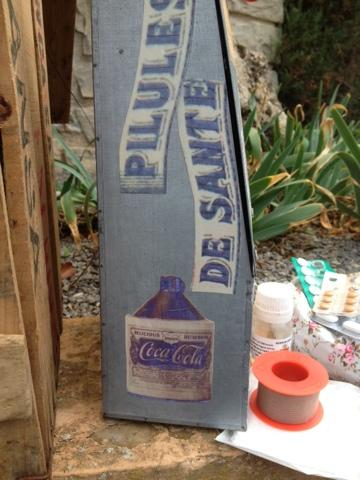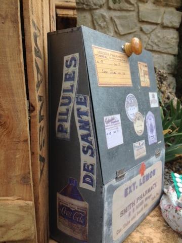 Me imprimieron motivos de farmacia y botiquines encontrados por internet,sólo los recorté y empecé a hacer decoupage con cola blanca disuelta en agua.Más cola que agua.Al final otras capas encima para proteger todas las piezas?.También podría haber puesto barniz,pero me sobraba bastante preparación.