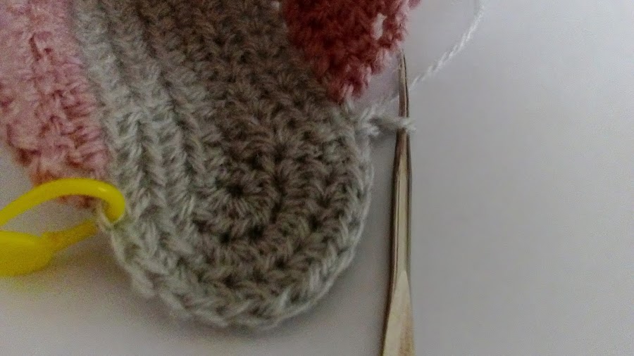 3- Subimos con 2 cadenas que van a contar como primer punto.Medios puntos altos (11 en total) y donde hicimos el primer aumento de los 7 hacemos 2 medios puntos altos juntos en cada punto (quedan 14 medios puntos altos).Del otro lado 9 mp altos y en el primer aumento de los 6 que hicimos hacemos igual,dos mp altos juntos en cada punto (12 mp altos en total).Cerrar en la primera cadeneta de las dos que hicimos
