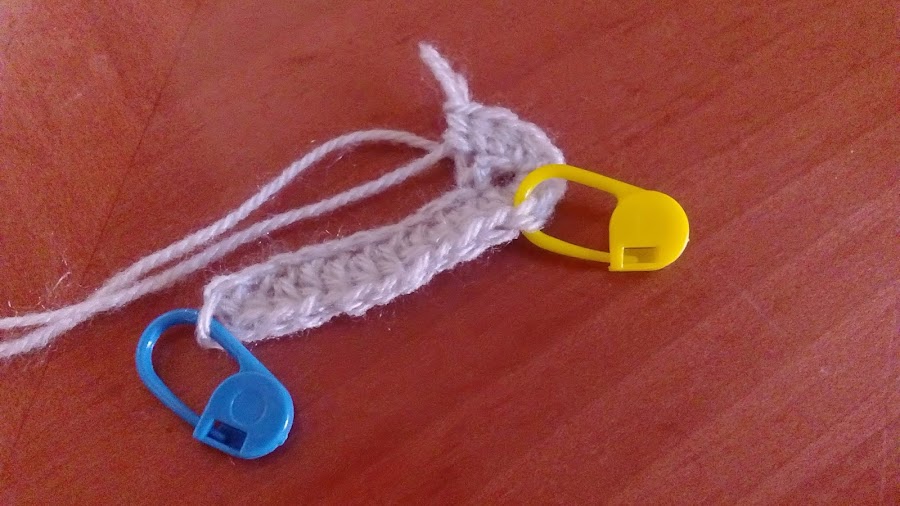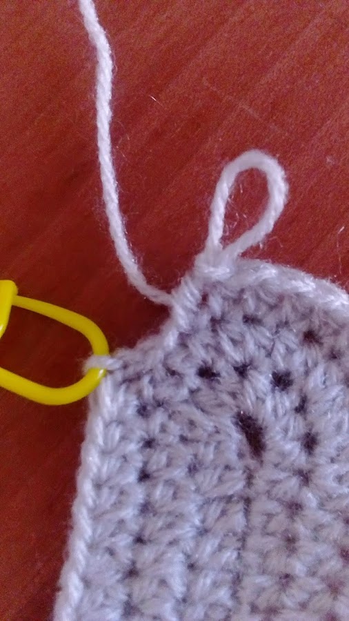 2- Enganchamos hilo para los laterales justo en el punto después de los 14 aumentos(después del marcador).Hacemos 3 cadenetas ya que todo ahora va a ser a punto alto.
