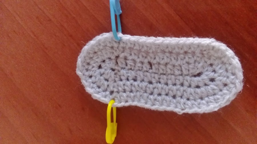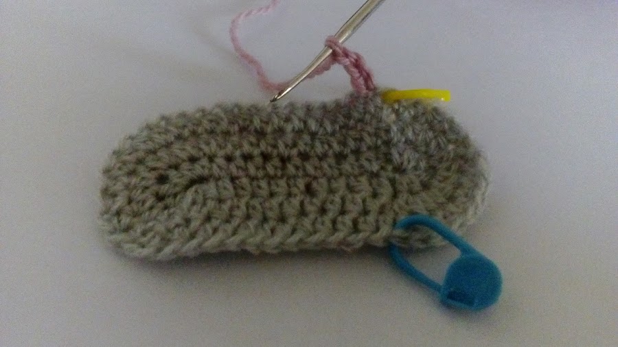 1-Marcar los 14 puntos que nos quedaron de los aumentos de la suela y los reservamos para la puntera.(Localizamos el primer aumento de la vuelta tres y ponemos el marcador en el punto que le corresponde arriba en la vuelta 4)