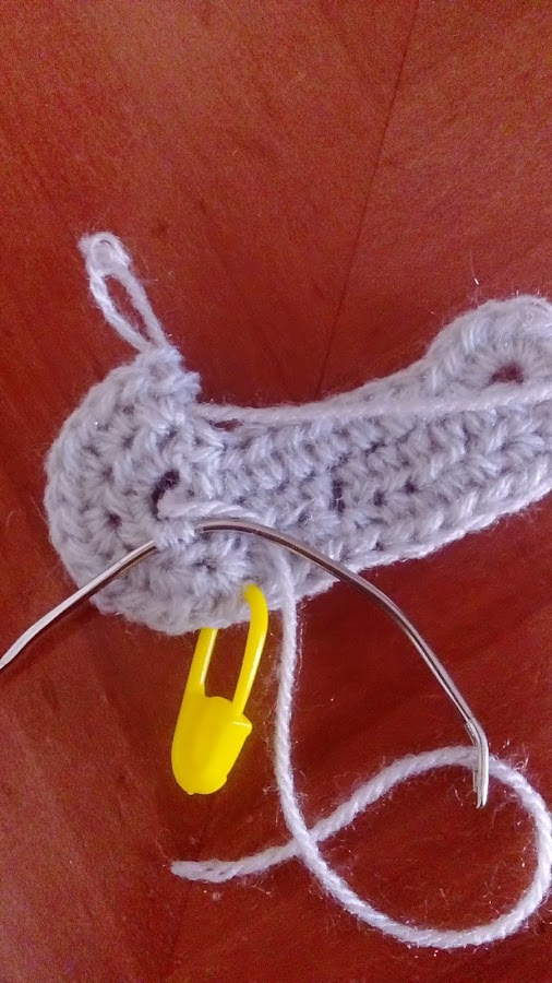 2- Darle la vuelta y por la parte del revés,dar unas puntadas en los laterales de la puntera (en el color gris con una o dos puntadas vale)