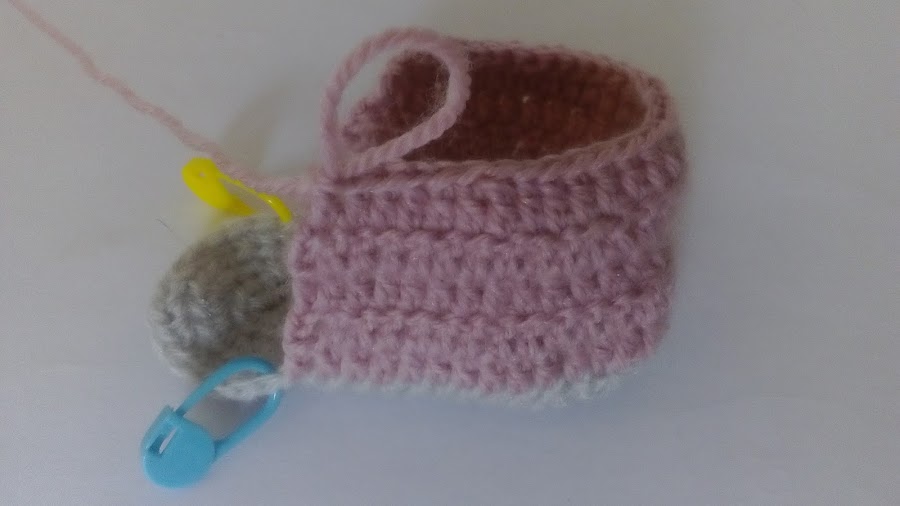 1-Enganchar hilo con una cadeneta justo en el punto después del lateral.En el primero de los 14 puntos que teníamos marcados.Hacer 3 vueltas de puntos bajos (14 puntos bajos, la primera cadeneta que hicimos se cuenta como primer punto)