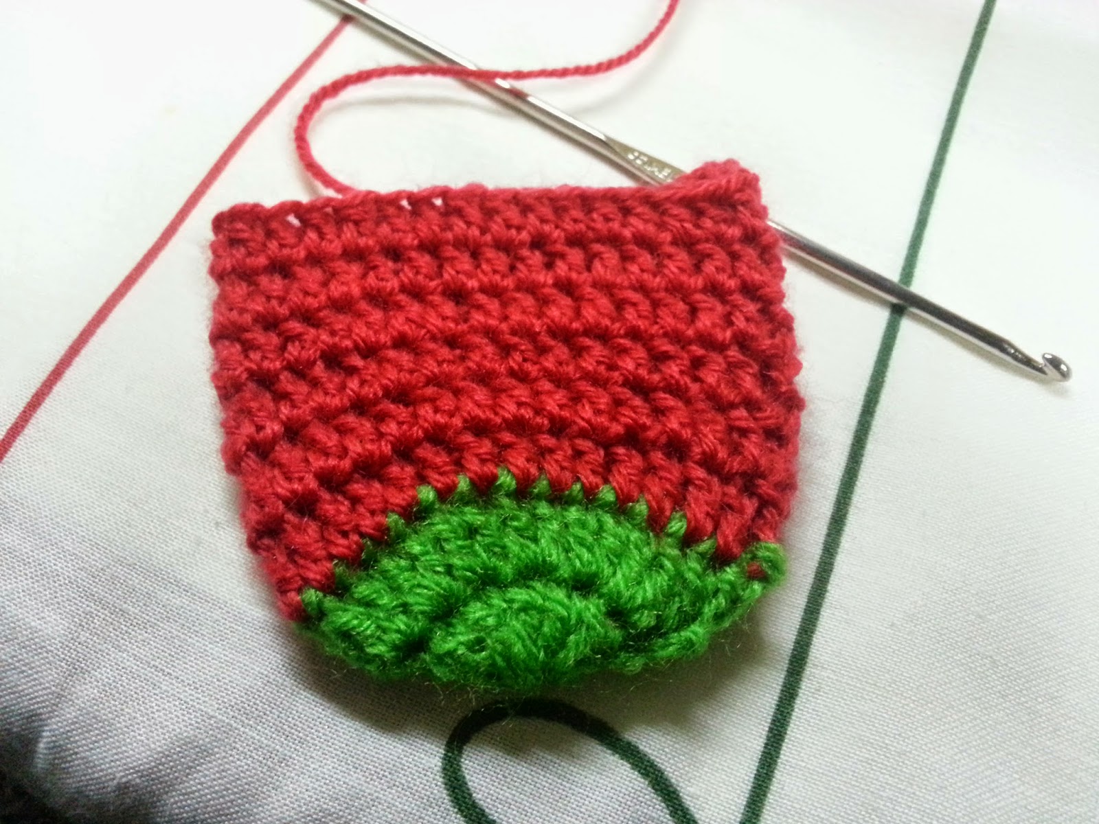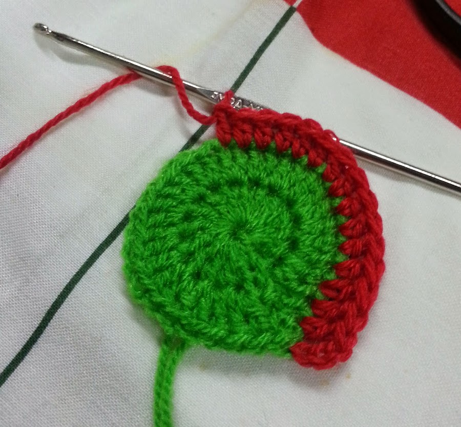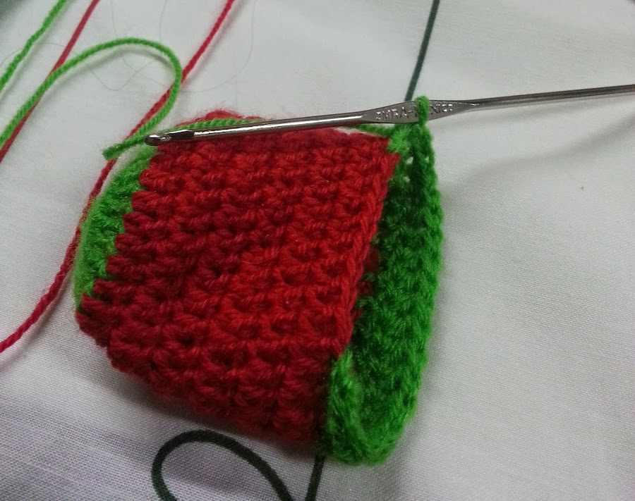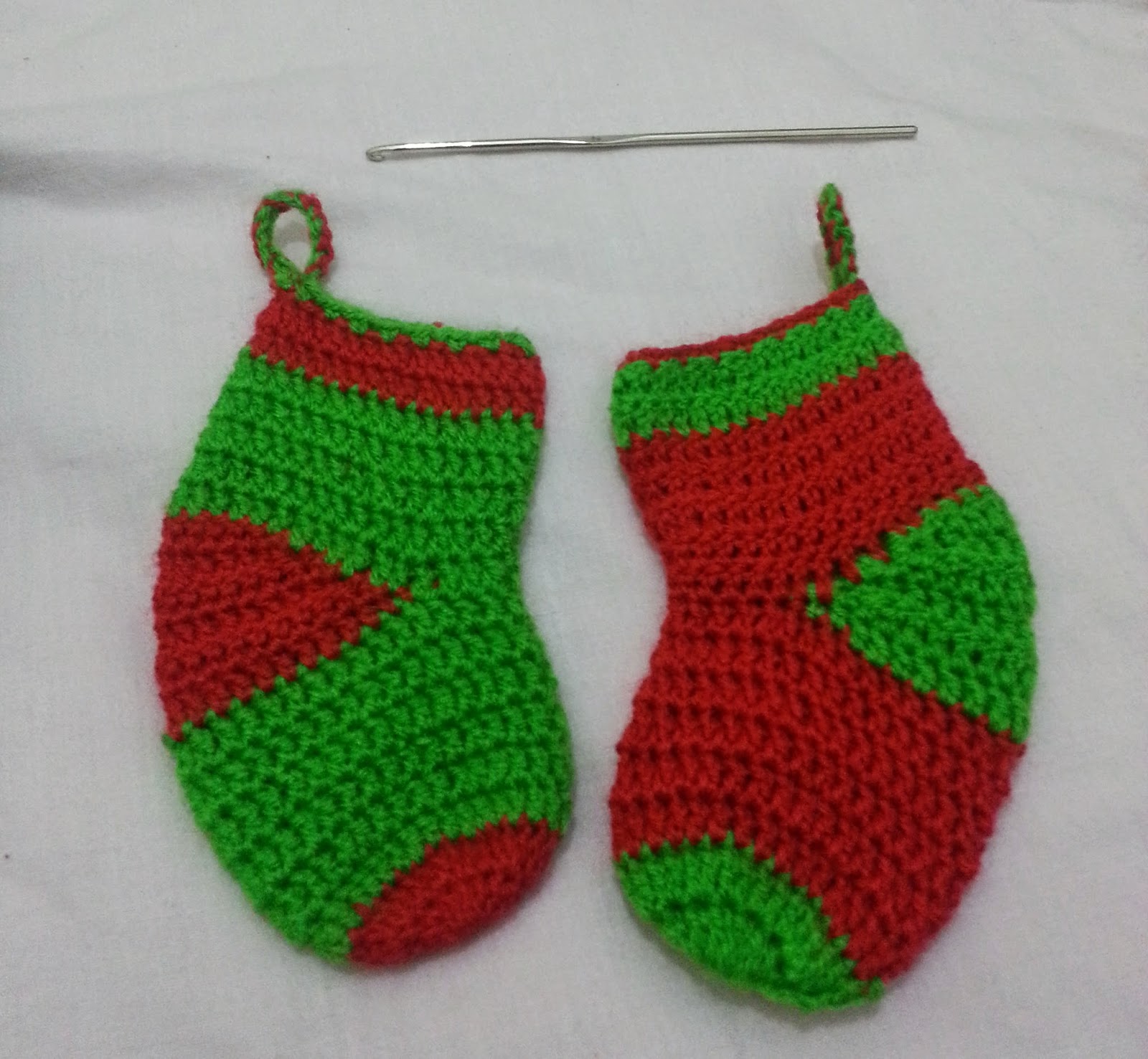 Cuando lleguen al punto que originalmente fue nuestro punto inicial, es decir, a la mitad del talón, agregan el color A y hacen un punto bajo y 14 cadenetas al aire cerrándolas con un punto enano en el mismo punto, de esta forma hacemos el aro para colgarlo. Si 14 cadenas no es lo suficientemente grande pueden hacer más.