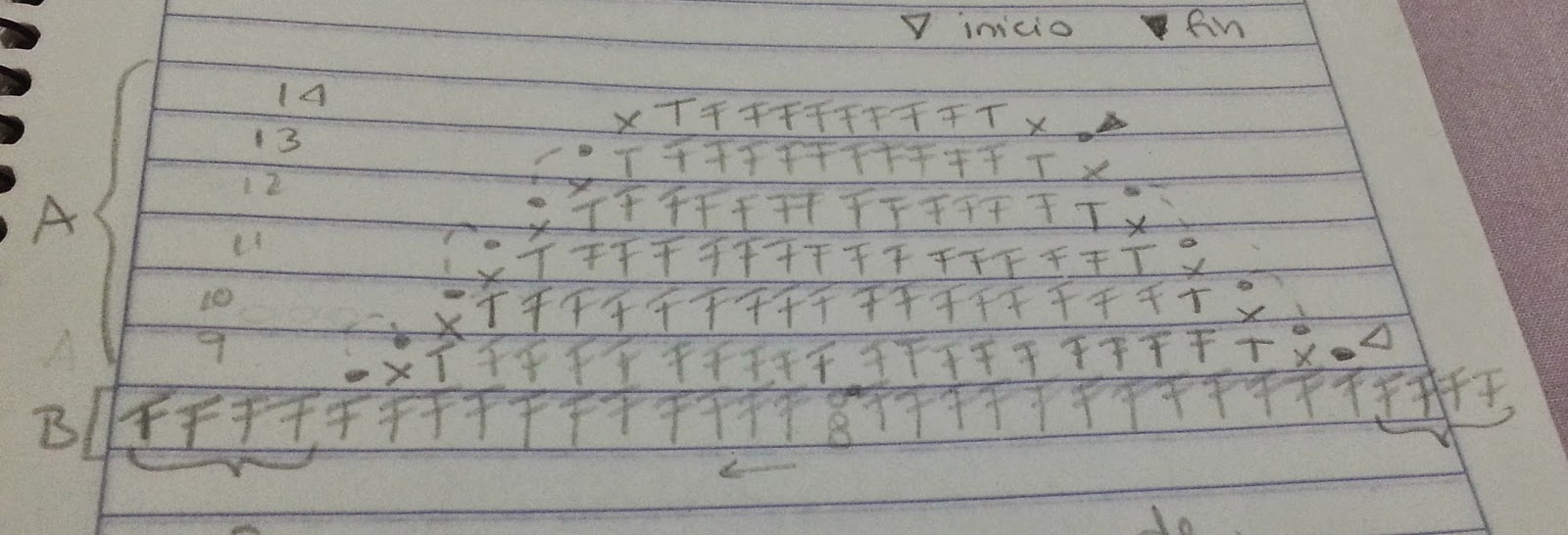 En este momento cuando hacemos el punto enano de la vuelta 8 al final, cortamos la lana.y cambiamos al color A de nuevo para hacer el talón, que se teje yendo y volviendo. Usando el patrón siguiente nos podemos guiar:
