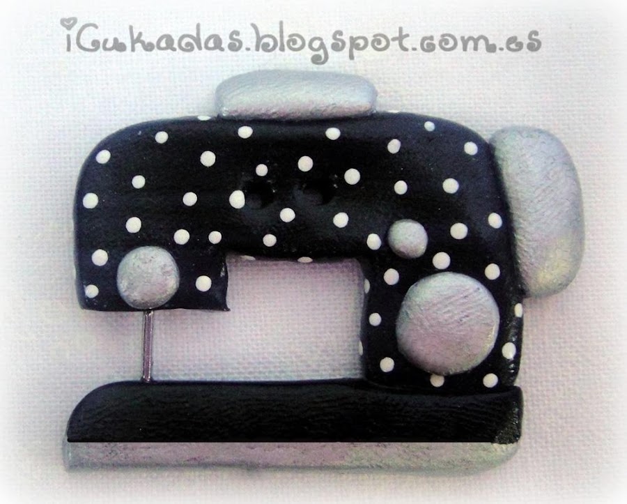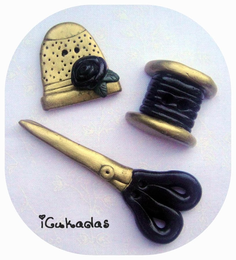 Están hechos de fimo, y algunos detalles van pintados a mano, los detalles plateados o dorados siempre, y a veces otras cositas, y dentro de la temática de costura, ¿que podía hacer? máquinas de coser no podían faltar, y ya puestos, tijeras, bobinas, y un dedal.