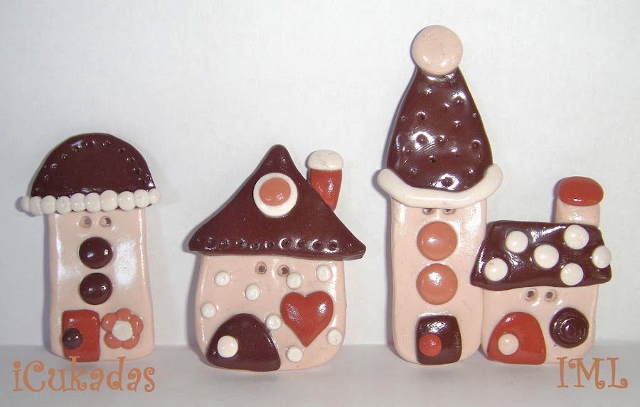 Estos son de los primeros que hice, cuando el fimo se me revelaba, no tenía cortadores ni herramientas, ni idea de lo que estaba haciendo, solo sabía que quería hacer casas, así que usé fimo neutro y los pinté, y esto es lo que salió