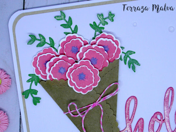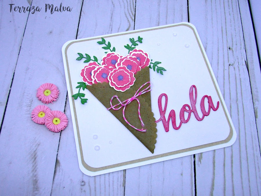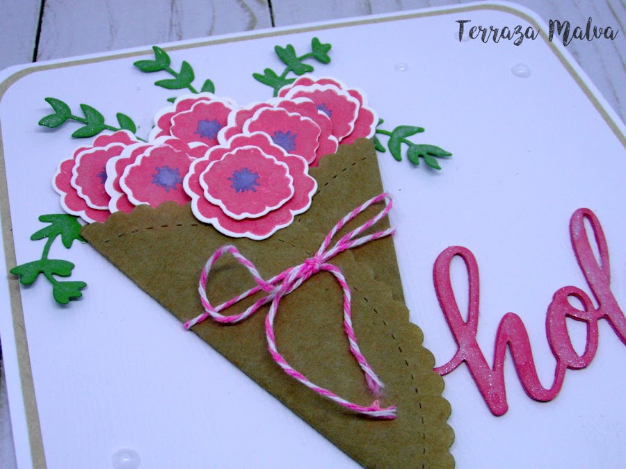 Con una blonda de papel kraft he formado el envoltorio del bouquet, al que he puesto un montón de flores de un juego de troqueles y sellos de La Pareja Creativa.