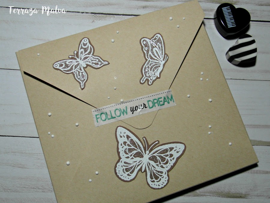 He tenido que hacer un sobre 3D para poder poner esta tarjeta tan gordita. Lo he decorado con unas mariposas embosadas en blanco (y más Nuvo drops...jejejeje).