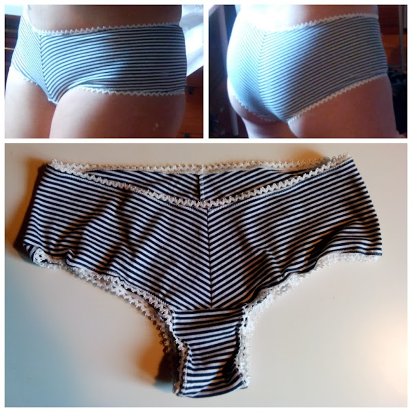Saqué el patrón sobre otras y en cosa de una horita las tenía listas. Cuando me quise dar cuenta ya tenía el elástico cortado de la cintura y para las piernas (no sé si realmente se pueden llamar así, pero lo de para las ingles quedaba un poco extraño) no había suficiente, así que tocó fruncir un poco, creía que me apretarían y se marcarían todas las chichas, pero que va, son muy cómodas.