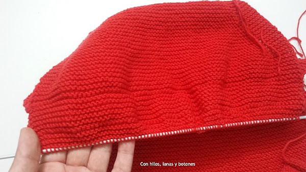 Una vez unidos los 3 volantes tejemos 8 vueltas a punto bobo y 4 vueltas en punto jersey o punto liso.