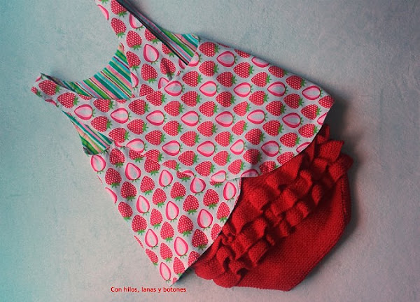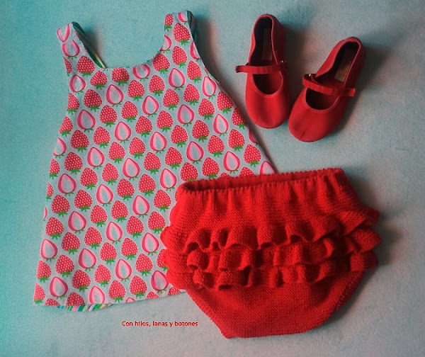 El primero fue el pantalón con volantes en el culete que le hice a mi niña con patrón de Cosotela. Patrón al que le saqué partido y repetí para coser el conjunto pajaritos. Para la misma niña del conjunto pajaritos había hecho un poco antes un conjunto de vestido, braguita, chaqueta y capota. Y, claro está, la braguita tenía volantes en el culete. Esa peque es una de mis víctimas habituales y ha lucido varias veces volantes en el culete por mi culpa, la penúltima fue con la ranita sunsuit del año pasado y la última con las braguitas de punto que os traigo hoy.