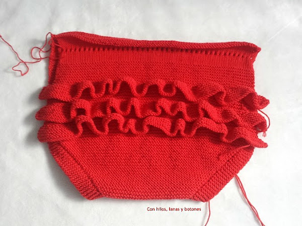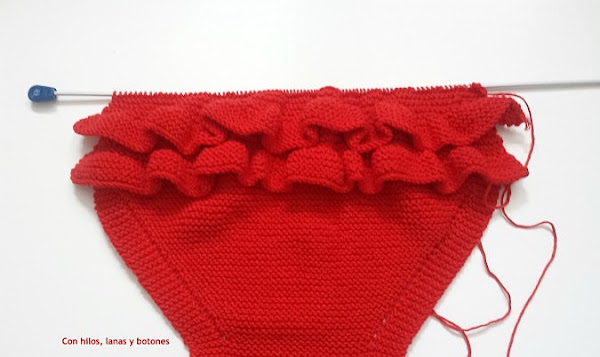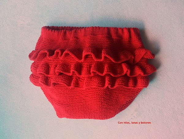 Y ya tenemos unas braguitas listas para estrenar. Estas braguitas las podéis hacer también con dos volantes en lugar de tres, o incluso con uno sólo en todo el contorno de la braguita a modo de faldita. Seguro que queda ideal. Los volantes también se pueden hacer en punto jersey en lugar de punto bobo. Para que no se ricen se podrían hacer una o dos vueltas a punto bobo y luego el resto a punto jersey.