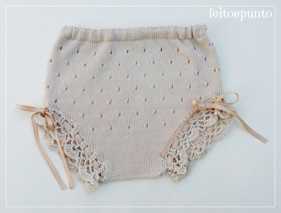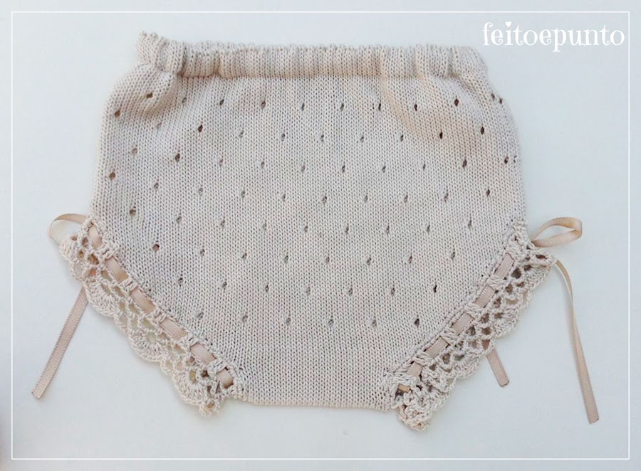 Es una braguita muy sencilla, la que hago siempre, esta vez rematada con el remate de ganchillo de Rosa Bricio. Es un remate muy mono, que sienta bien a cualquier tipo de braga, y hace un volantito sobre las piernas muy gracioso.