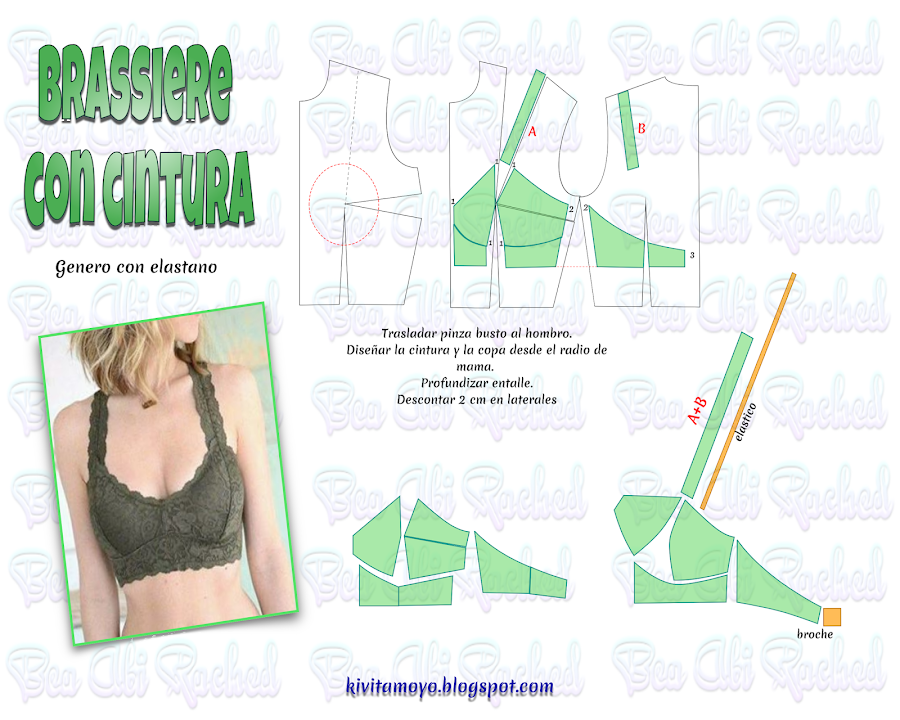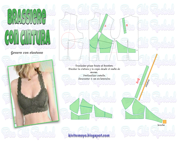 Trazar para usar generos con elastanos. Diseñar desde el patron base del cuerpo a medida sin ningun tipo de holgura. Cerrar la pinza de busto del lateral trasladandola al hombro. Tomando como referencia el radio de mama, diseñar en el bajo busto la copa, acentuando la profundidad de la pinza. Descontar en el centro delantero 1 cm y en el lateral 2cm. Diseñar la espalda a la misma altura del delantero, descontando 2 cm en el lateral y 3 cm en el centro para incorporar el broche. El bretel lleva una tira de puntilla del mismo genero. Cerrar la pinza en la cintura del delantero y separar las copas en dos partes. Cerrar el pinzado de entalle del trasero creando una sola pieza.