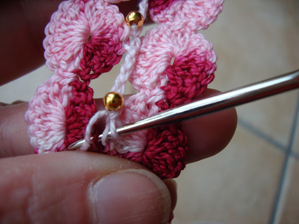 Me ayudé de otro ovillo solo rosa clarito del mismo tono. Antes de empezar, enhebramos el nº de abalorios que vayamos a utilizar (mejor pasarnos que después ya no hay remedio) y los mantenemos incorporados a la madeja; en este caso sólo añadí 10 porque iba a poner uno en la unión de cada pareja de círculos.