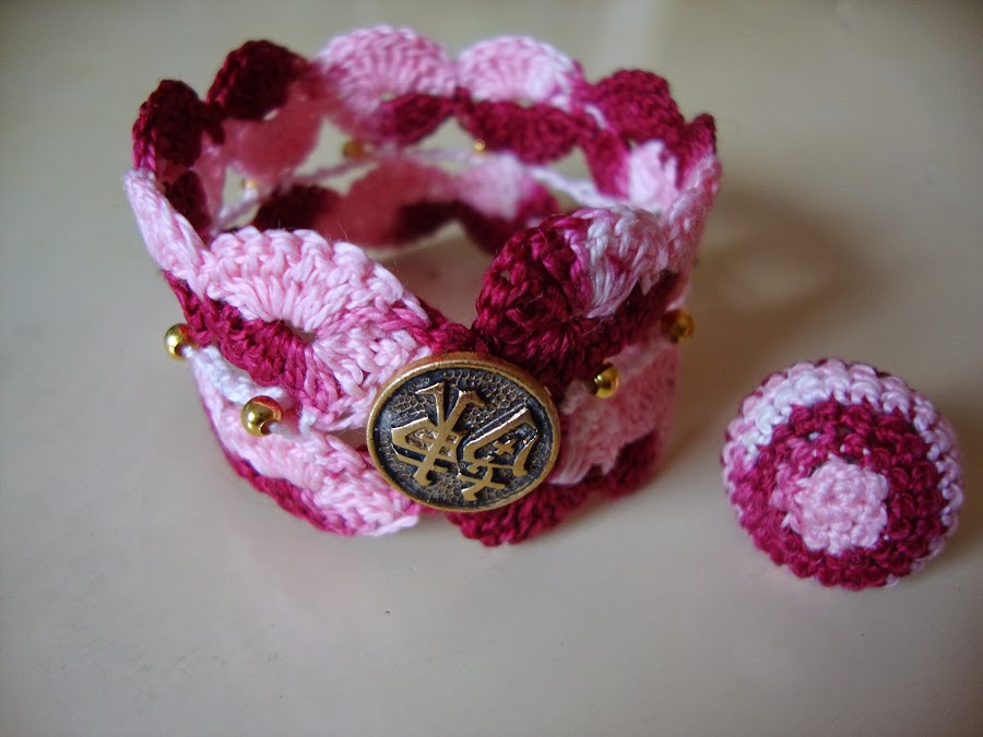 Una vez terminada, rematamos los extremos, escogemos un botón que nos guste (o lo forramos como el anillo) y hacemos un ojal con una cadeneta simple o cadeneta cordón para que quede más gruesa.