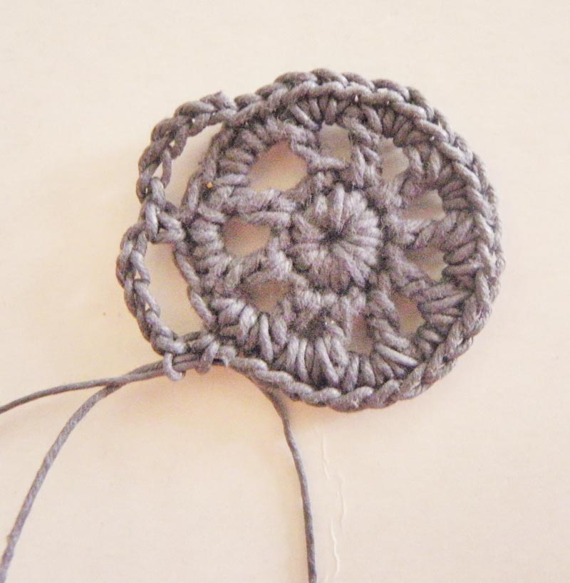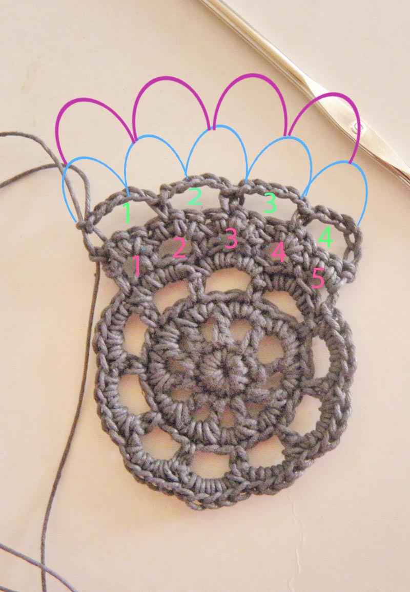 Deslizas el hilo hasta el centro de uno de los arcos y comienzas la vuelta con cinco cadenetas hasta que llegues al final y en esos arcos, en la vuelta siguiente, haces cinco puntos bajos en cada uno de ellos, siguen siendo diez arcos..
