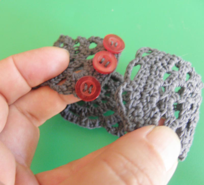 termina con puntos enanos en recto sobres los de la vuelta última. En uno de los lados con cadenetas haz los ojales y en el otro cose botones como cierre.