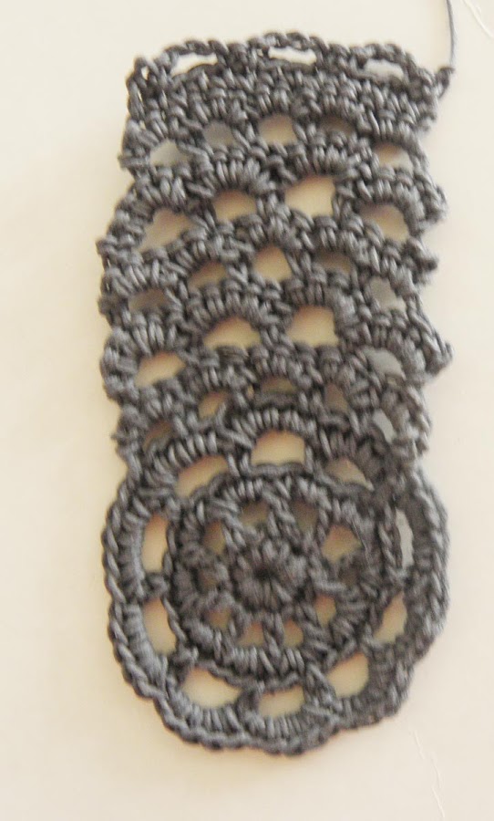 Ya en serio, desde la mitad del centro del motivo cadenetas de ida y vuelta, la tira central es más corta ,unas cuatro cadenetas en mi caso. Las tres tiras, que luego se doblan por la mitad, las tejes seguidas, sin cortar el hilo desliza el hilo por el arco del motivo hasta llegar a su centro y allí hacer la tira de cadenetas siguiente.