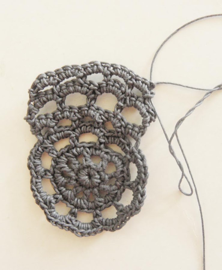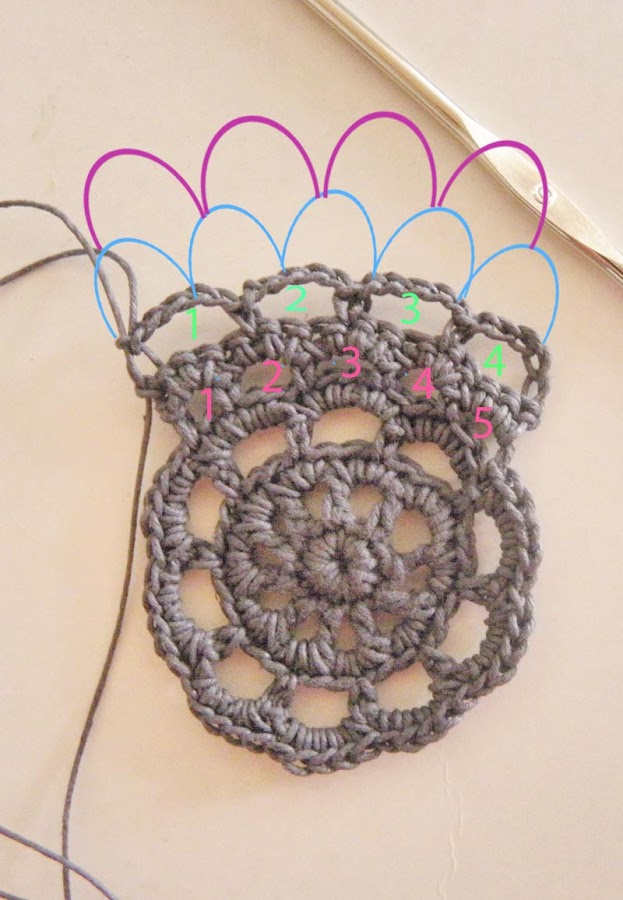 Cinco cadenetas cerradas en redondo y en ellas 10 puntos enanos, cierras y subes con cuatro cadenetas( primer palote más una cadeneta ) y punto alto,cadeneta. punto alto, cadeneta...así hasta que llegues al principio y veas que tienes 10 arcos, cierras y sobre la cadeneta de separación de los puntos altos hacer tres puntos bajos en cada arco.