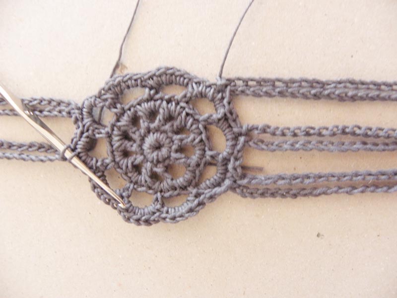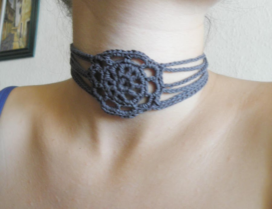Vamos con la gargantilla. He usado el mismo motivo como adorno central, pero eso como más te guste este u otro, siempre que tenga " pétalos " pares para distribuir bien las tiras de cadenetas..