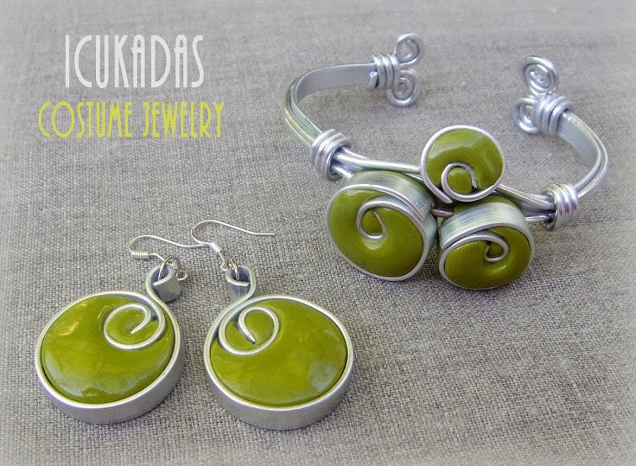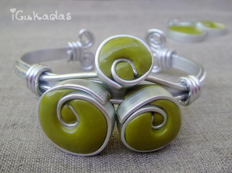 Y como mi hermana quería un brazalete y unos pendientes, y tenían que ser de este verde oliva exactamente, la única salida era sacar el color con el fimo y batallar con el alambre.