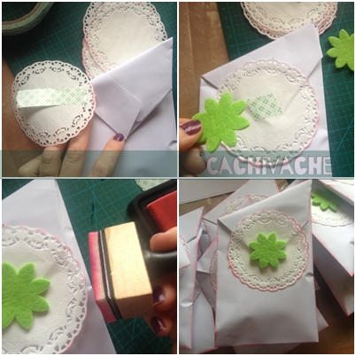 Con un sobre una blonda, tinte y una flor de fieltro.